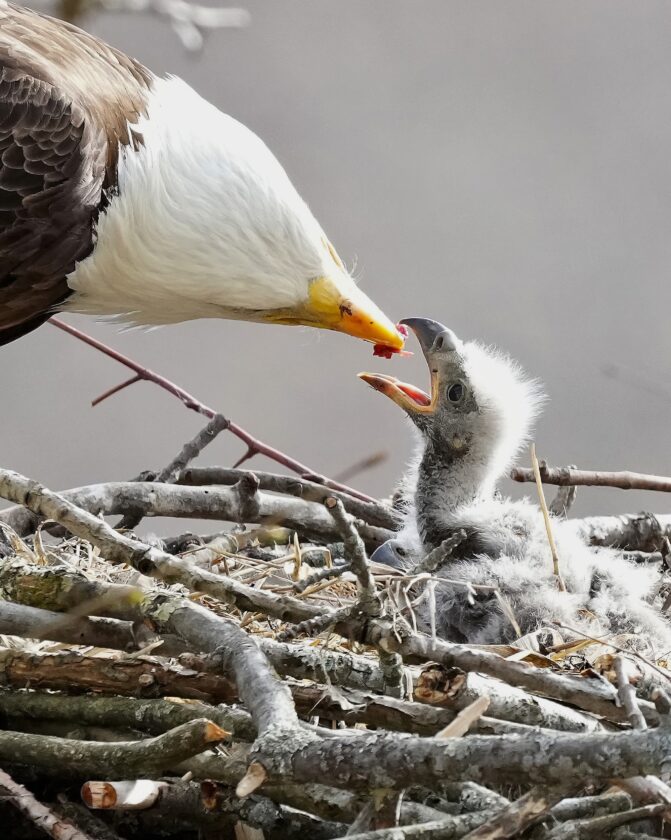 A bald eagle feeds a 10-day old eaglet in this photo by Linda Stager.